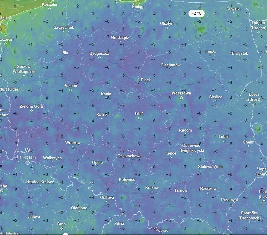 Oczywiście lokalnie i przy gruncie sytuacja mogła być znacznie trudniejsza. Taka też prawdopodobnie będzie nadchodzącej nocy. Przymrozek może chwycić już przed północą, a w niektórych częściach kraju temperatura przy gruncie ma spaść do -8°C. Dotyczy to m.in. okolic Grójca, ale także regionów na zachód od Wrocławia, które zazwyczaj nie doświadczają najniższych temperatur w skali kraju. Mrozu i przymrozków możemy spodziewać się wszędzie za wyjątkiem północno-zachodniego skrawka kraju.