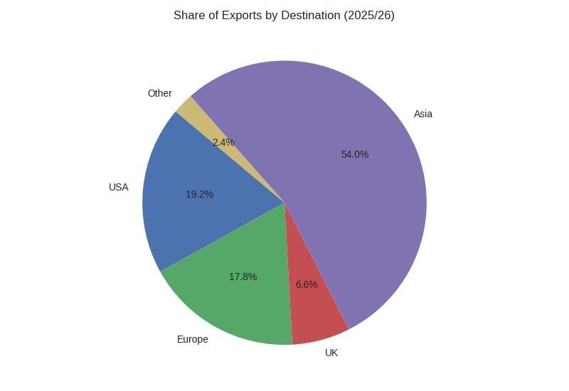 Najważniejsza zmiana w tym sezonie dotyczy kierunków eksportu chilijskiej borówki. Azja sukcesywnie buduje swoją pozycję głównego nabywcy chilijskich borówek. Dla przykładu, dostawy w tamten region świata wyniosły 1838 ton, co przełożyło się na 54% całkowitego eksportu w 47. tygodniu bieżącego roku. W tym bloku Korea Południowa objęła dominującą pozycję, pochłaniając zdecydowaną większość tego wolumenu, bo około 1632 tony.