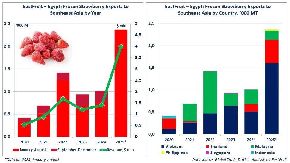 Choć pozycja Egiptu jako drugiego największego dostawcy mrożonych truskawek do Azji Południowo-Wschodniej jest zagrożona, to globalnie kraj ten nadal umacnia swoją rolę czołowego eksportera mrożonych truskawek, z rosnącymi dostawami na rynki takie jak Dominikana i Brazylia.
