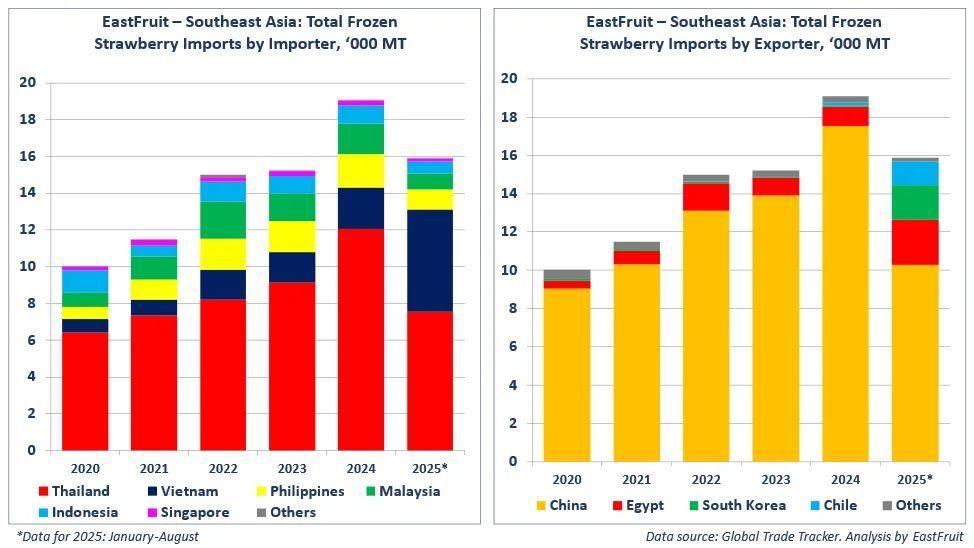 Chiny nadal pozostają dominującym dostawcą mrożonych truskawek do Azji Południowo-Wschodniej, choć ich udział w rynku znacznie spadł. Podczas gdy wcześniej Chiny odpowiadały za około 90% importu regionu, do końca sierpnia ich udział spadł do poziomu 65%.