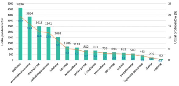 Najwięcej producentów ekologicznych było w województwach podlaskim, warmińsko mazurskim i mazowieckim. Najmniejsza liczba producentów była w województwie opolskim, śląskim i kujawsko-pomorskim.