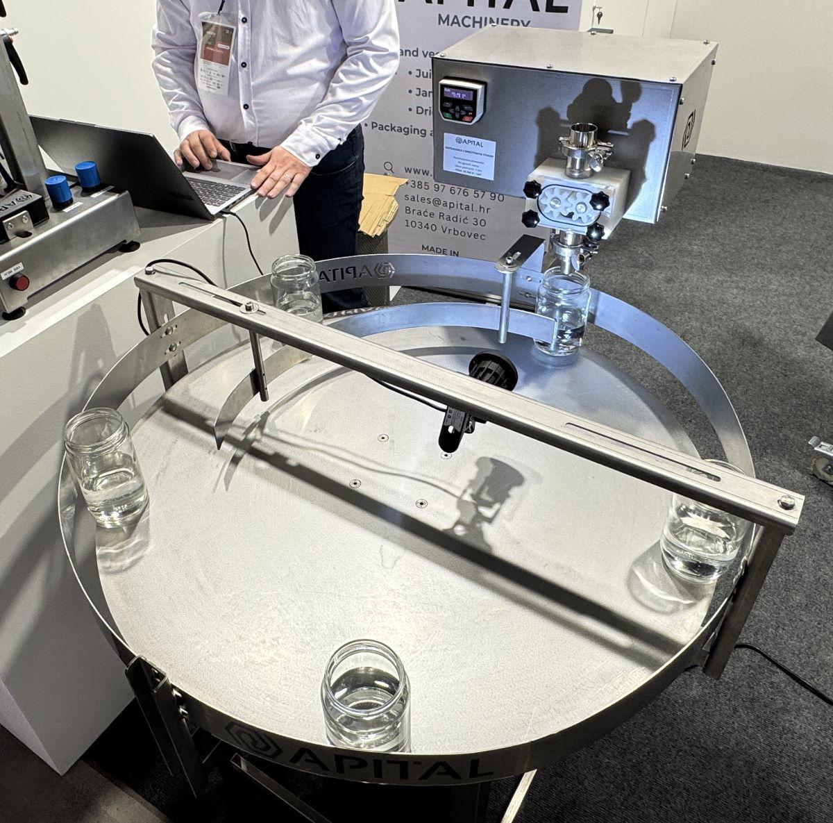 Na stoisku Apital obejrzeć można było także nalewarkę do cieczy gęstych. To urządzenie automatycznie dozujące zadaną ilość wyposażone dodatkowo w stół obrotowy przyspieszający pracę. Ruch urządzenia sprawia, że wypełnianie słoików odbywa się bez udziału operatora. Jego zadaniem po kalibracji nalewarki jest wyłącznie układanie na stole pustych pojemników i odbieranie z niego pełnych. W przypadku tego zestawu urządzeń gwarancja także trwa dwa lata, a jego cena wynosi 16 960 zł netto.