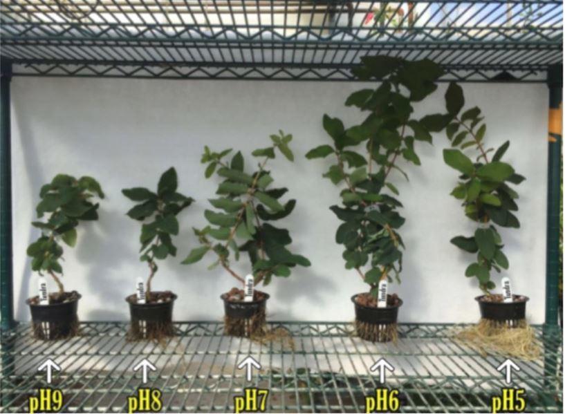 Jednocześnie, badanie nie wykazało żadnych podgatunków preferujących gleby zasadowe. Statystycznie nie było różnicy między kolejnymi poziomami pH, ale istniała różnica statystyczna między najwyższym a najniższym poziomem pH, przy czym najniższy poziom był najlepszy. Krzewy wyglądały zdrowo przy wszystkich poziomach pH, ale były dorodniejsze przy niskich poziomach pH roztworu, tj. 5,0 i 6,0.