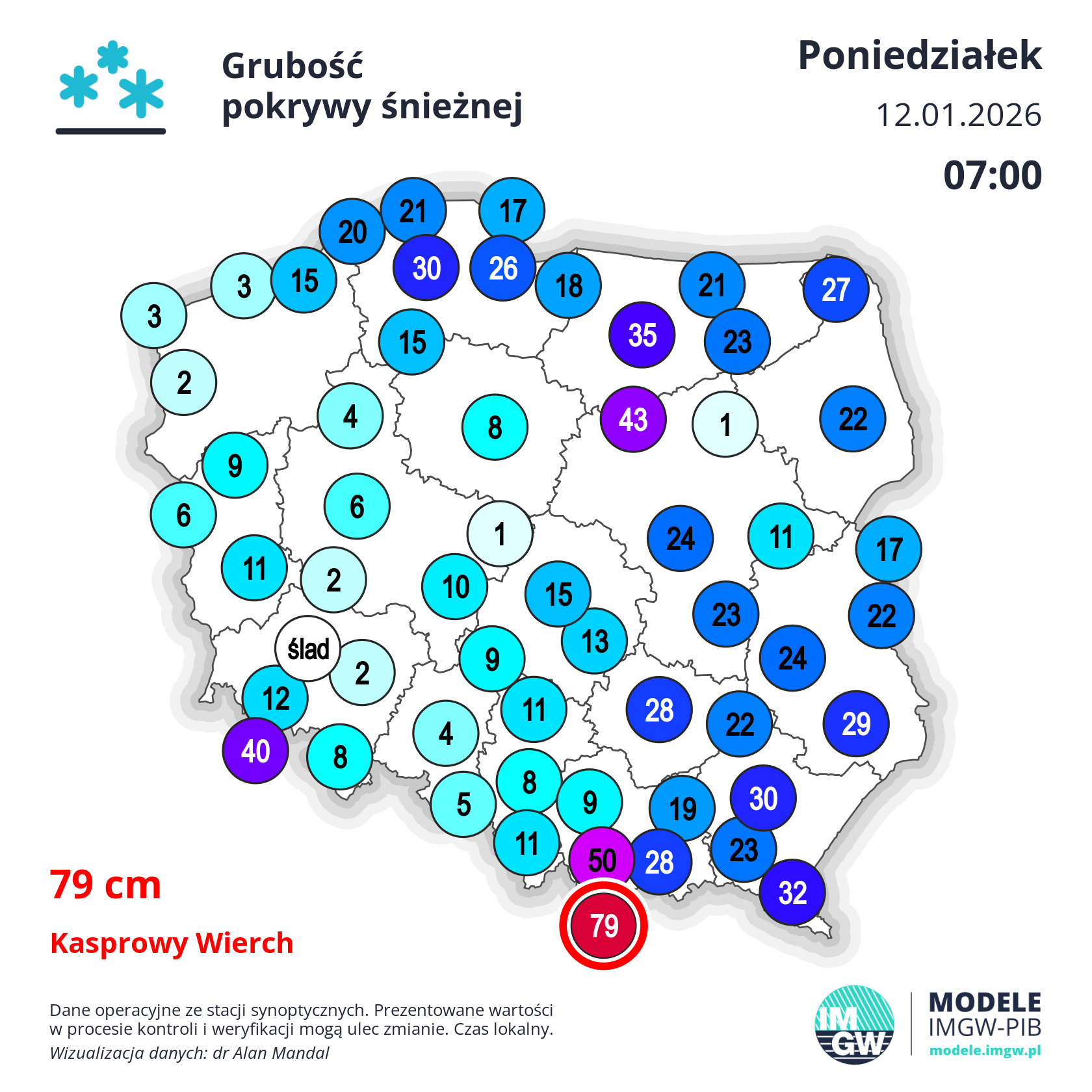 Rozkład pokrywy śnieżnej różni się w zależności od rejonu kraju. Jak widać na załączonej grafice IMGW, większość rejonów sadowniczych może cieszyć się z dużej ilości białego puchu. Nadal nie możemy mówić o sytuacji ogólnokrajowej, bo nawet, jak widać niżej, są także miejsca, gdzie ilość śniegu jest dosłownie śladowa.